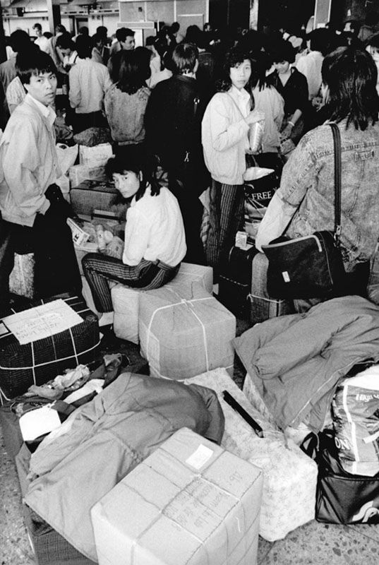 Vietnamesische Vertragsarbeiter*innen am Flughafen Schönefeld, 31.Mai 1990, Bundesarchiv_Bild 183-1989-0501-018 Foto: Hirschberger