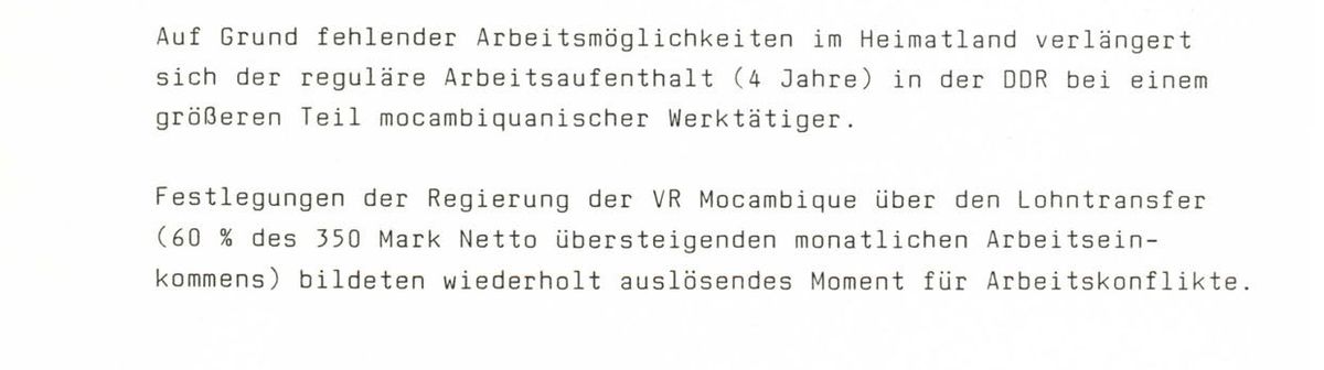 Besonders drastisch trifft das Prinzip des Lohntransfers die Arbeiter*innen aus Mosambik. Ihnen wird lediglich ein Grundeinkommen von 350 Mark zugestanden. Vom darüberhinausgehenden Nettolohn werden ihnen zunächst 25 Prozent und ab 1986 60 Prozent abgezogen. Ihnen wird versprochen, dass die transferierten Summen in Mosambik für Sie auf einem Konto angelegt werden. Nach ihrer Rückkehr sollen sie sich damit eine Existenz aufbauen können.